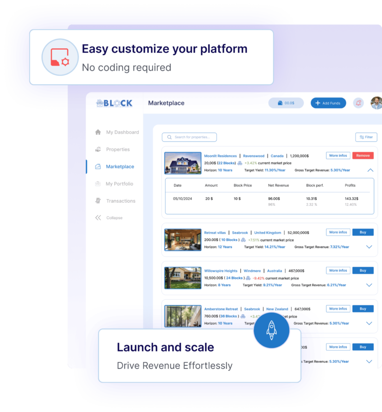 Offer a secure marketplace for clients to trade property blocks seamlessly.